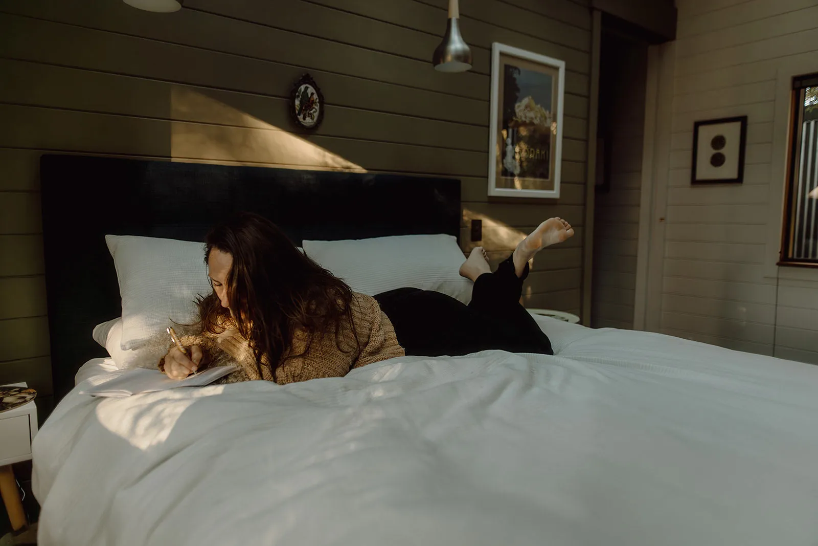 Wander across the raised timber walkway as light shifts across the wetlands and the forest settles into evening. The platform at the far end opens west toward the Paparoa maunga, offering uninterrupted views as the sun drops behind the ridgeline. It’s a simple ritual — a drink in hand, boots off, watching the sky change colour in real time.