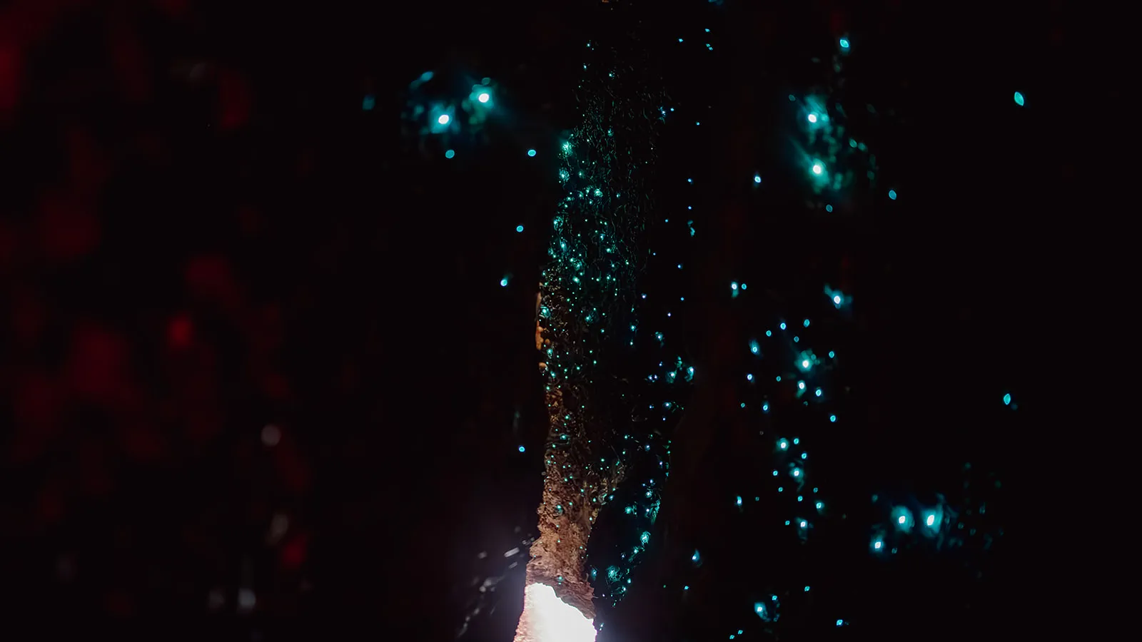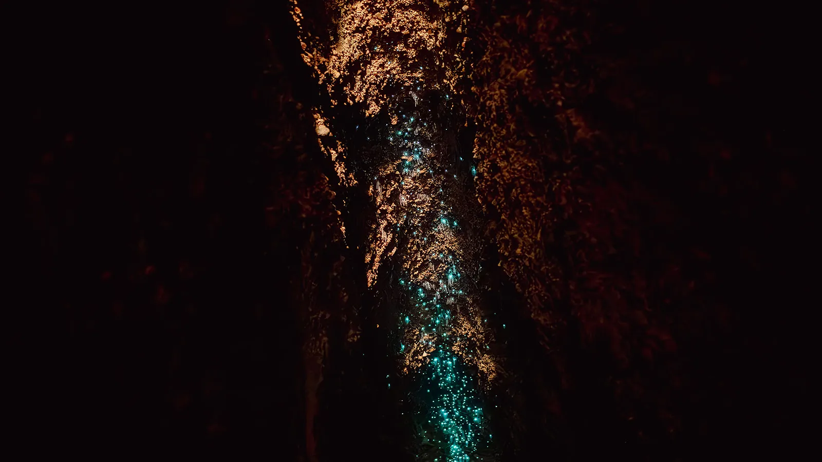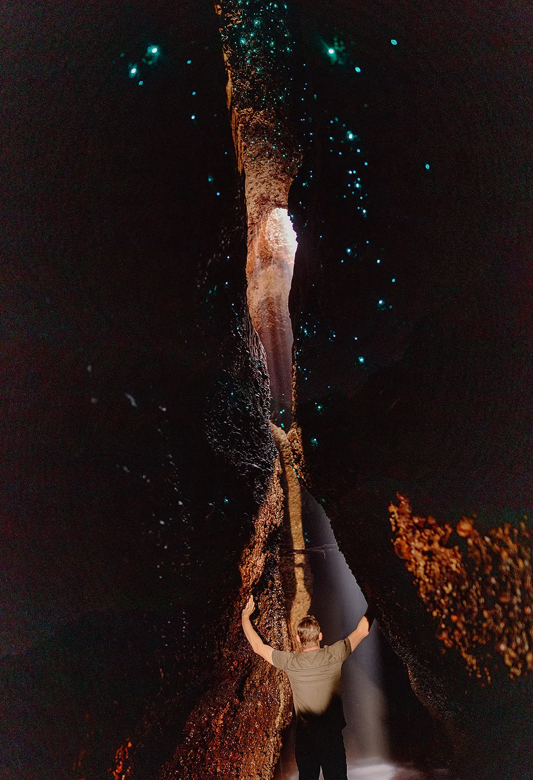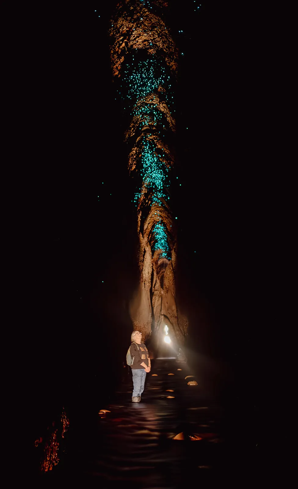 As your eyes adjust, glow worms begin to appear — small, steady points of bioluminescent light scattered across the ceiling like a mid-day Milky Way. An internal waterfall echoes through the tunnel, and the constant flow of water reminds you that this is living terrain, not a staged attraction.
